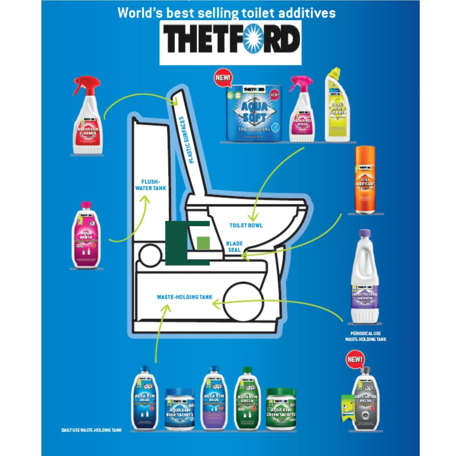 Thetford Eucalytus & Grey Water Fresh Concentrate Contains x 1 Thetford Aquakem Blue Euclyptus 0.78L and x 1 Grey Waste Fresh Concentrate 800ml. Thetford Grey Waste Fresh Concentrate 800ml: Concentrated, strong, effective fluid which prevents nasty grey water smells. Gives nasty smells coming from the drains no chance! Overview: Reduces deposit formation in the grey water tank Outstanding grey water odour control Keeps the grey water longer fresh and clean Odour free discharging of your grey water tank Concentrated 800 ml Thetford Aquakem Blue Euclyptus 0.78L: Aqua Kem? Blue Concentrated Eucalyptus is one of the newest members of Thetford?s well known Concentrated family! Aqua Kem? Blue Concentrated Eucalyptus leaves a scent of wellness behind in your RV! Overview: Attractive eucalyptus fragrance with a touch of mint 1 dosage lasts up to 5 days Convenient small bottle, less weight* (* compared to Aqua Kem? Blue 2L) Significantly improved waste liquefication for easier tank emptying* (* compared to Aqua Kem? Blue 2L) Significantly improved reduction of gas build-up* (* compared to Aqua Kem? Blue 2L)